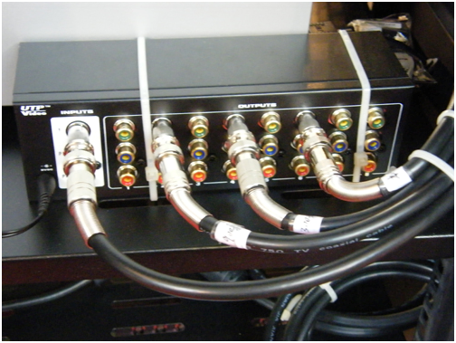 在VGA信號延長方面的展示平臺是利用優(yōu)特普高清VGA傳輸設(shè)備UTP816AT和UTP801AR作為演示產(chǎn)品,我們將UTP816AT分配出來的一路信號作為原始信號展示在一臺NEC的液晶屏上,另一路通過優(yōu)特普高清雙絞線傳輸設(shè)備延長300米后進入另一臺同一品牌和同一信號的液晶屏上。