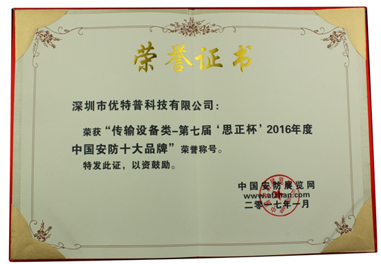 近日,由中國(guó)安防展覽網(wǎng)主辦的“思正杯”第七屆中國(guó)安防十大品牌暨百?gòu)?qiáng)工程商頒獎(jiǎng)盛典在福建寧德萬(wàn)達(dá)嘉華大酒店隆重舉行。優(yōu)特普憑借自身的品牌實(shí)力和影響力三年連獲“傳輸設(shè)備類中國(guó)安防十大品牌大獎(jiǎng)”榮譽(yù)稱號(hào)。