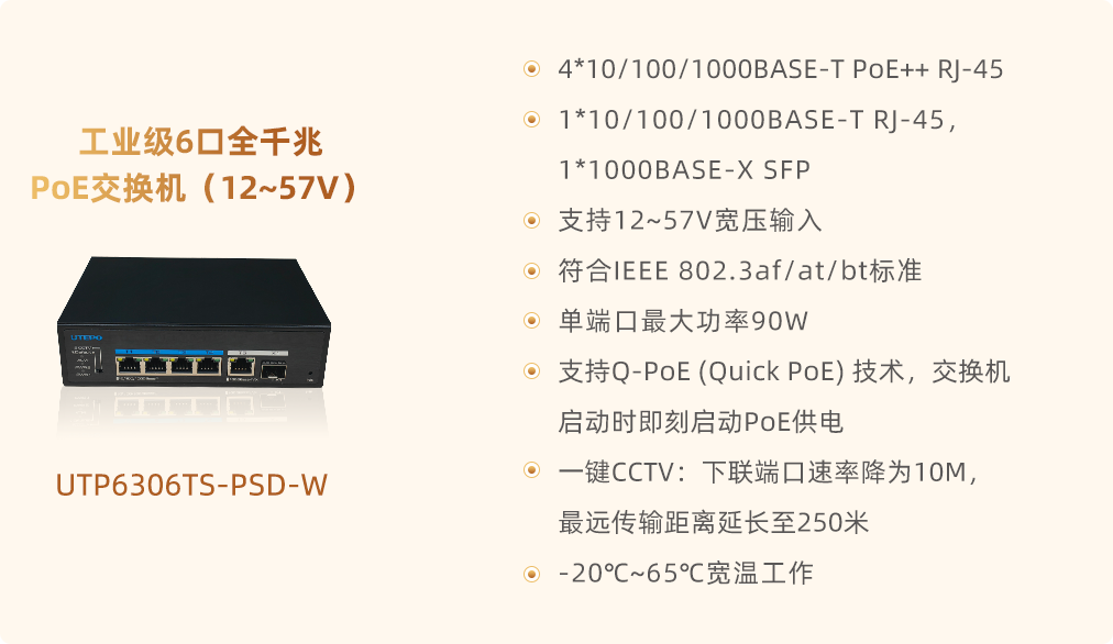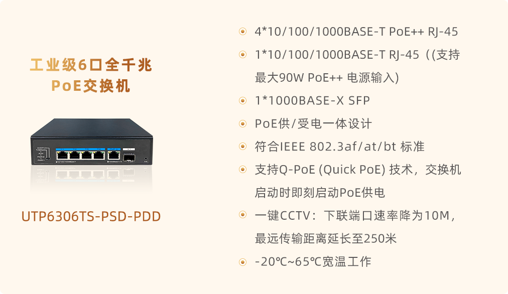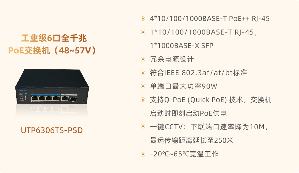 特別值得一提的是,優(yōu)特普6系列工業(yè)級(jí)PoE交換機(jī)搭載了創(chuàng)新的Q-PoE(Quick PoE)技術(shù)。這一技術(shù)打破了傳統(tǒng)PoE交換機(jī)在啟動(dòng)時(shí)需等待系統(tǒng)軟件控制的限制,實(shí)現(xiàn)了交換機(jī)啟動(dòng)時(shí)即刻啟動(dòng)POE供電的功能,立刻為所連接的PD設(shè)備提供運(yùn)行電源。這不僅大幅縮短了設(shè)備啟動(dòng)時(shí)間,提高了整體系統(tǒng)的響應(yīng)速度,還有效降低了因等待供電而導(dǎo)致的系統(tǒng)初始化延遲,對(duì)于追求高效、實(shí)時(shí)的應(yīng)用場景來說,無疑是一個(gè)巨大的優(yōu)勢(shì)。