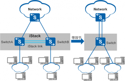 指將多臺(tái)支持堆疊特性的交換機(jī)設(shè)備組合在一起,從邏輯上組合成一臺(tái)交換設(shè)備。如下圖所示,SwitchA與SwitchB通過(guò)堆疊線纜連接后組成堆疊iStack,對(duì)于上游和下游設(shè)備來(lái)說(shuō),它們就相當(dāng)于一臺(tái)交換機(jī)Switch。