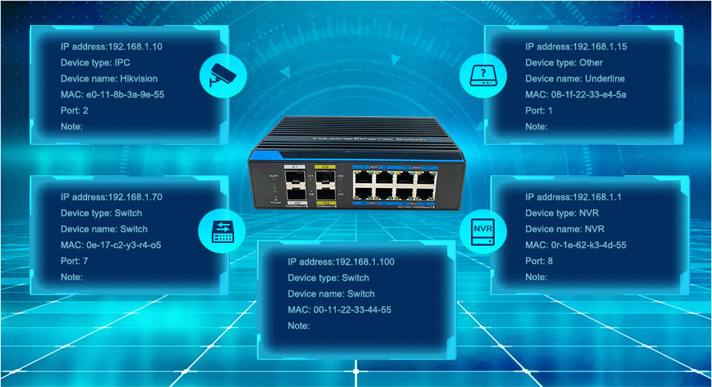 UTP7612S-PSD360支持ONVIF協(xié)議,可以自動識別支持ONVIF的IP攝像機、網(wǎng)絡視頻錄像機(NVR)和其他支持ONVIF的IP設備,如網(wǎng)絡視頻解碼器等。通過LLDP協(xié)議在WEB界面自動生成一份虛擬拓撲視圖,用戶可以通過拓撲圖了解其網(wǎng)絡連接的設備信息,如IP地址、設備類型、設備名稱、MAC地址等。
