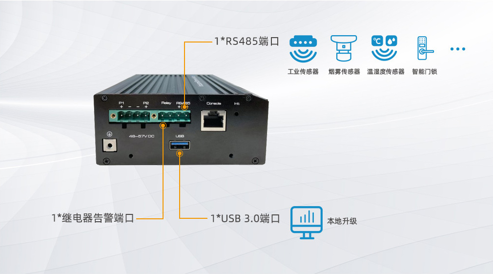 1*RS485端口:支持定制化服務,可接入各種物聯(lián)網(wǎng)設備或作為串口服務器,如:工業(yè)傳感器、煙霧傳感器、溫濕度傳感器、智能門鎖等。支持Modbus協(xié)議轉換。