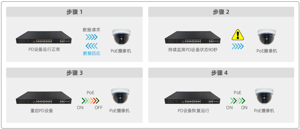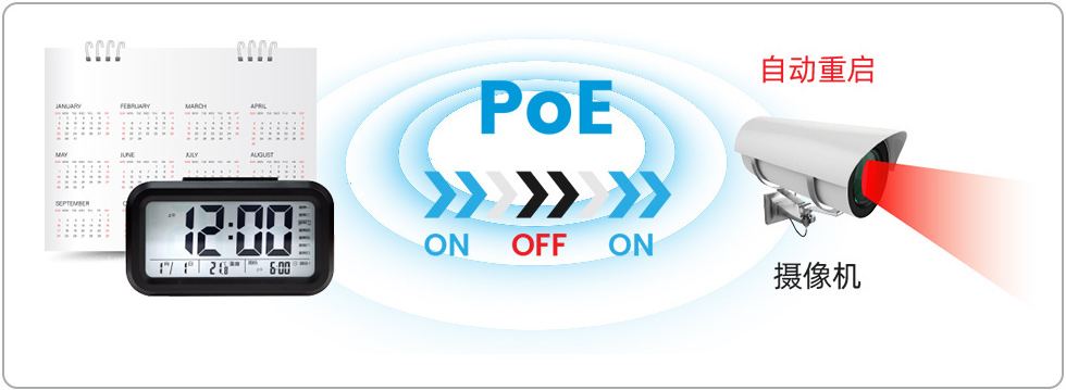 支持PoE Watchdog(看門狗)功能,實現(xiàn)PoE攝像機掉線自動偵測、自動重啟,減少系統(tǒng)維護成本。