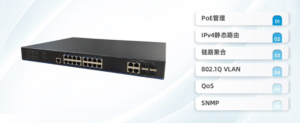 提供豐富的二層管理功能,支持PoE管理、IPv4靜態(tài)路由、802.1Q VLAN、QoS、鏈路聚合、SNMP等。